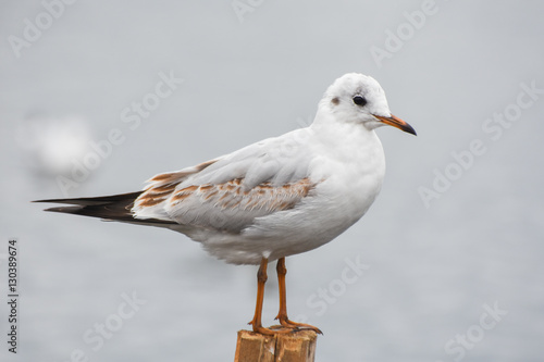 Fototapeta premium Seagull standing on a stump in marina.