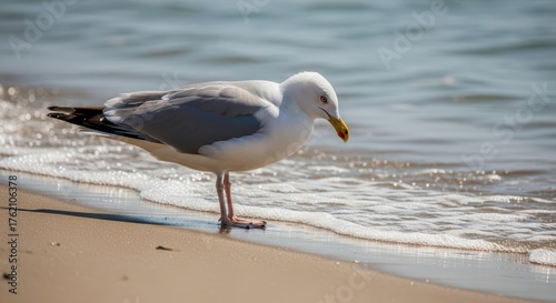 © photoplotnikov, Fototapeta premium Seagull standing on sandy beach near ocean waves in serene coastal scene