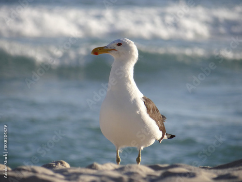 Fototapeta premium Seagull standing on sandy beach with ocean waves in background