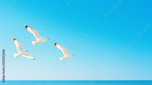 © pattozher, Obraz premium Seagulls' Aerial Dance: Three seagulls soar through the vast, cerulean expanse of the sky above the calm, expansive ocean, embodying freedom and tranquility.