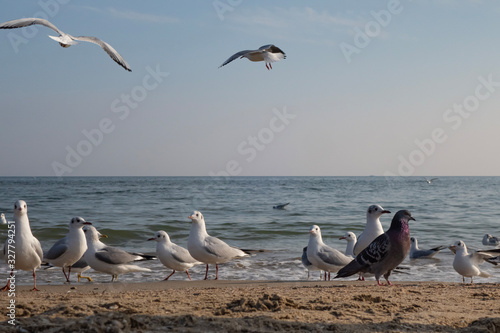 Obraz premium Seagulls and pigeons on the seashore on the beach on a sunny spring day.