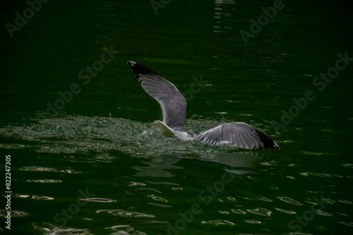 Fototapeta premium Seagulls dive into the water. Seagulls playing in the sea, taking off, floating.