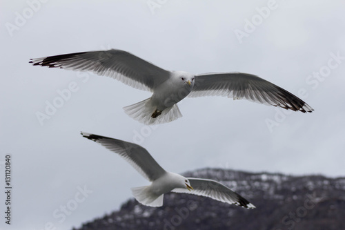 © Kseniia, Fototapeta premium Seagulls fly over the ship, which sails on Norwegian fjord