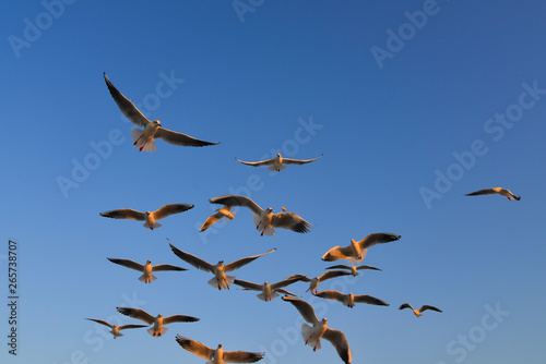 Fototapeta premium Seagulls flying in a blue sky background