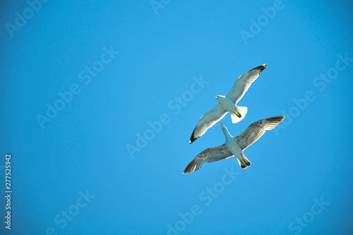 © stdemiriz, Obraz premium Seagulls flying in clear sky