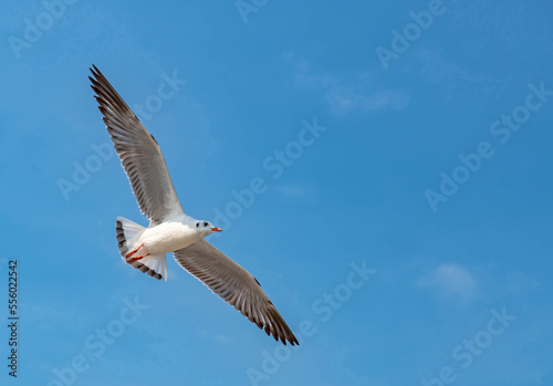 Obraz premium Seagulls flying in the blue sky, chasing after food to eat at Bangpu, Thailand.