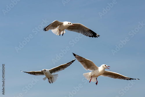 © Bobbyphotos, Obraz premium Seagulls flying in the blue sky, chasing after food to eat at Bangpu, Thailand.