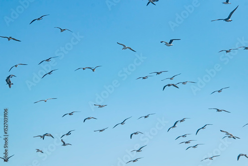 © altzaga, Fototapeta premium Seagulls flying on the blue sky