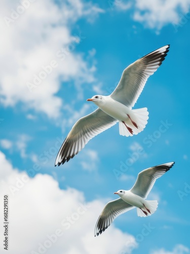 © Tim59, Fototapeta premium Seagulls flying over bright blue sky coastal area wildlife photography natural environment upward angle freedom concept