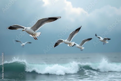 © Rommi, Fototapeta premium Seagulls Flying Over Ocean Wave on Cloudy Day