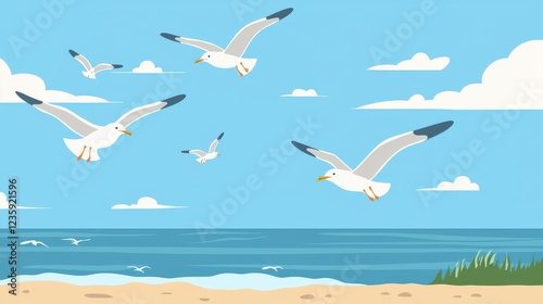 Fototapeta premium Seagulls flying over summer ocean, peaceful coastal setting,