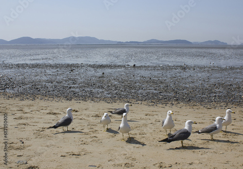 © binimin, Obraz premium Seagulls gathering on the beach
