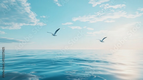 Fototapeta premium Seagulls gliding effortlessly above a tranquil ocean, the bright blue sky...