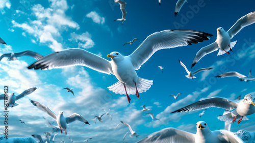 Obraz premium seagulls in blue sky with clouds. Generative Ai.