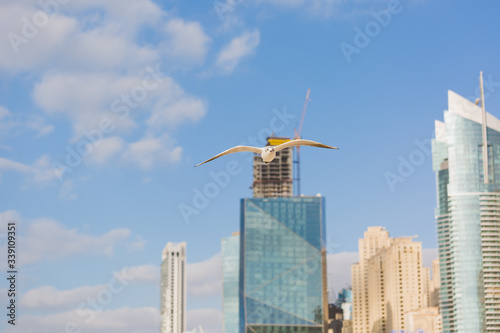Naklejka premium Seagulls in flight against the background of the sights of the old city,...