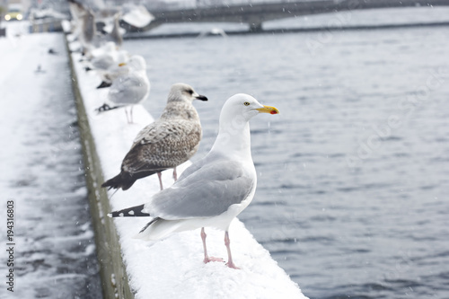 © Bart, Fototapeta premium Seagulls in snow on bridge