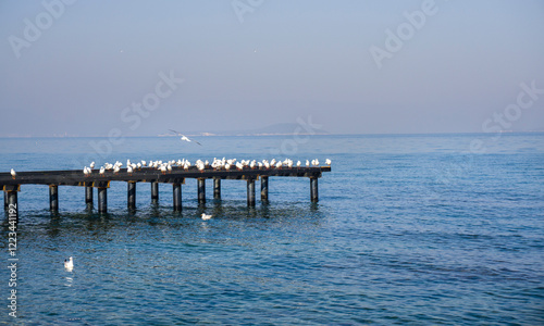 © Akin Ozcan, Fototapeta premium Seagulls on Wooden Pier