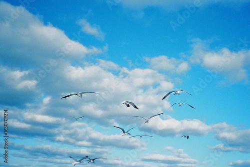 © Leda, Fototapeta premium Seagulls soaring across a bright sky with scattered clouds.