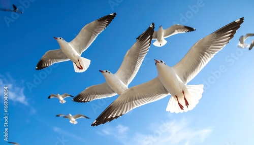 Obraz premium Seagulls soaring gracefully in a vivid blue sky, showcasing freedom and...