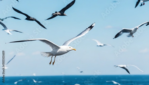Fototapeta premium Seagulls soaring in natural beauty of ocean ecology