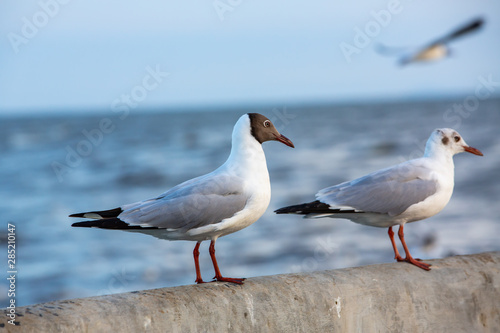 © eyepark, Naklejka premium Seagulls standing at Sukta Bridge, Bangpu, Samut Prakan, Province, Thailand, Larus brunnicephalus, Close up shot, Select focus, Birds photography travel