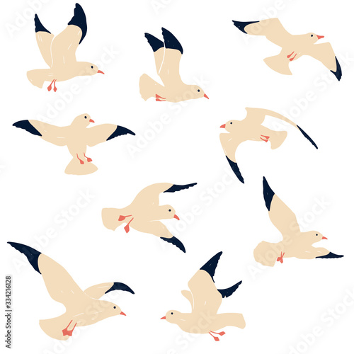 © Anastasiia, Fototapeta premium Seagulls vector illustration. Cute hand drawn cartoon seagull set isolated on white background