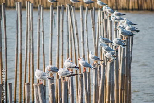 Naklejka premium Seagulls with sunset at Bang Pu beach Samutprakarn,Thailand