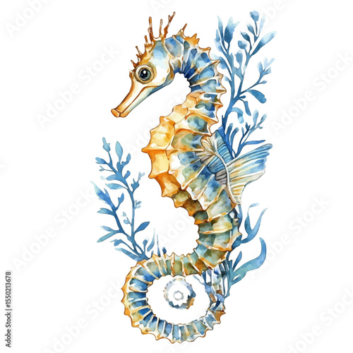 © AMIDCO, Fototapeta premium Seahorse Drifting Ocean Plants, watercolor clipart vector, isolated on a white background.