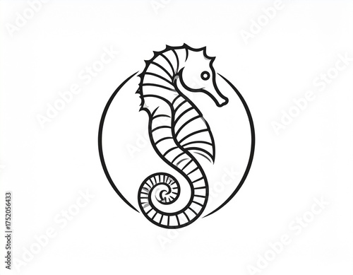 Fototapeta premium Seahorse Icon: A stylized black and white illustration of a seahorse curled within a circle, embodying the beauty and mystery of the ocean.