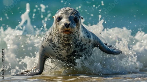 © djatu, Obraz premium Seal emerges from surf, its fur glistening with sea water.