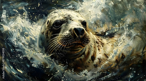 © Siasart Studio, Obraz premium Seal in the Ocean Waves - Oil Painting