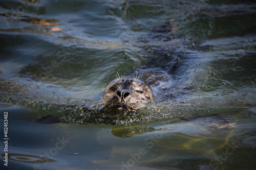 © doda, Fototapeta premium Seal is swimming in his own swimming pool in zoo. This is his habitat.