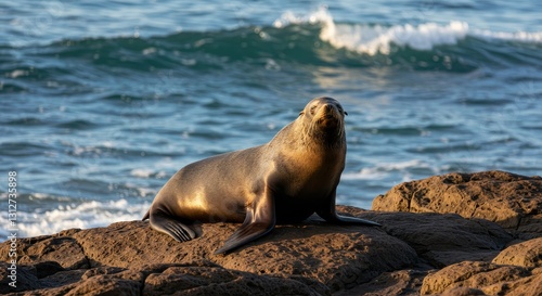 Fototapeta premium Seal on Rocky Coastline - A lone seal rests on dark rocks near the ocean, waves gently lapping in the background. Sunlight illuminates its fur