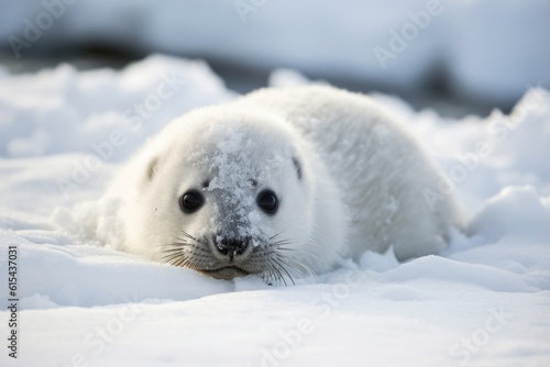 Obraz premium seal pup rolling in the snow, playfully biting at its ice-cold surroundings, created with generative ai