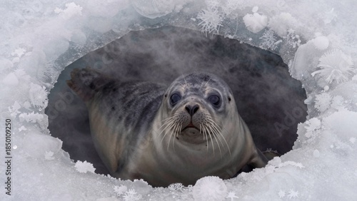 Obraz premium Seal swimming in a hole in the ice during the winter months in a cold environment, seeking food and warmth