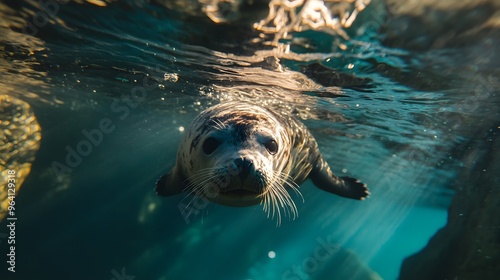 © simba kim, Fototapeta premium Seal Swimming Underwater in Sunbeams