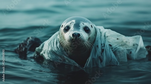 Fototapeta premium Seal trapped in plastic bag swimming in ocean