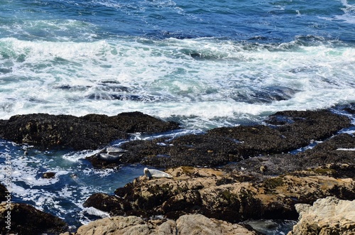 Fototapeta premium Seals suntan on rocks along Bodega Bay, California shore