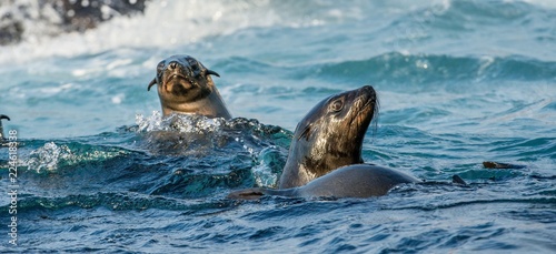© Uryadnikov Sergey, Obraz premium Seals swim in the water . Cape fur seal, Scientific name: Arctocephalus pusilus. Seal Island, False Bay, South Africa .