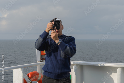 © Alexey Seafarer, Obraz premium Seaman with sextant on navigational bridge