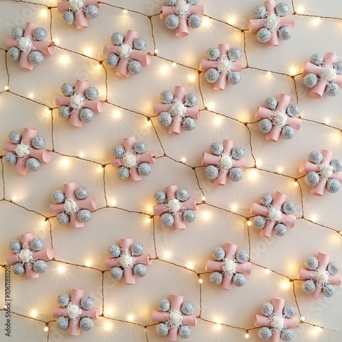 Obraz premium Seamless abstract pattern of pink and silver winter ornaments and glowing net fairy lights creates a cheerful holiday background.
