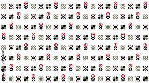© nirin, Naklejka premium Seamless abstract pattern with round flower and geometric element in black gray and orange on white background. Vector illustration, for shirt dress cloth textile table cover wallpaper decoration all