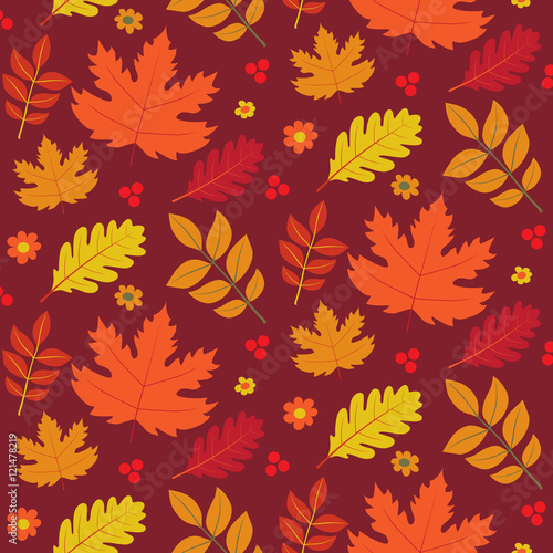 Obraz premium Seamless autumn vector texture with leaves of maple, oak. Pattern for...