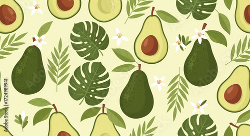 © GenerativeGenius, Obraz premium Seamless Avocado Vector Pattern with Leaves and Blossoms