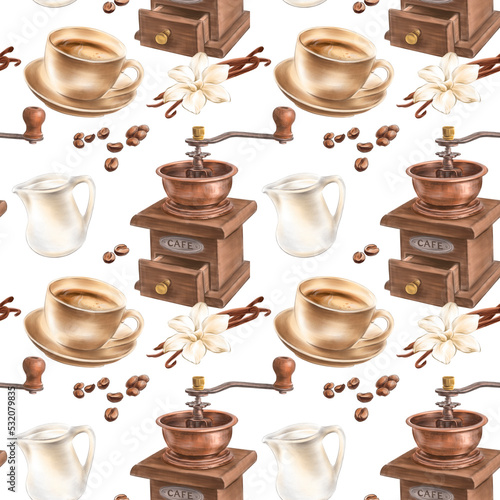 Obraz premium Seamless background with coffee grinder, coffee cup, vanilla flower and sticks, milk