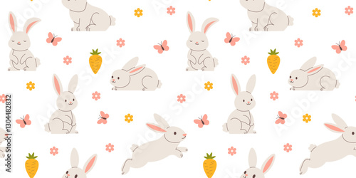 Fototapeta premium Seamless background with cute bunnies, Easter Rabbits, spring flowers and butterflies. vector illustration.