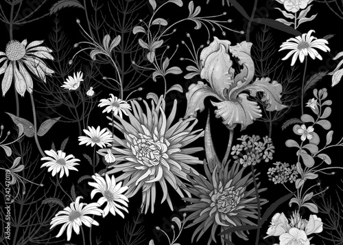 Naklejka premium Seamless background with wild flowers. Black and white pattern.