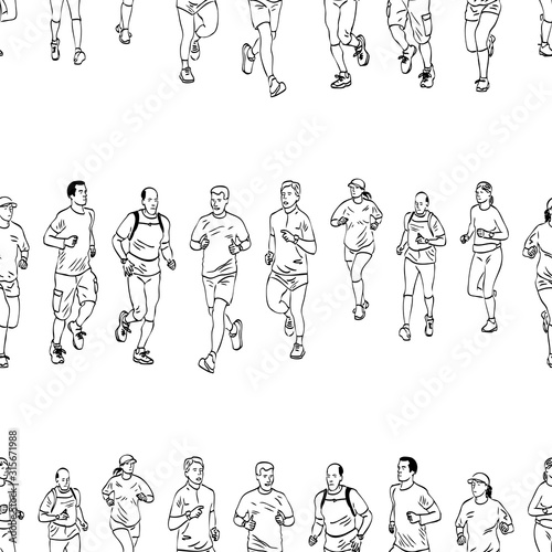 © avelksndr, Naklejka premium Seamless backSeamless background of sketches townspeople jogging