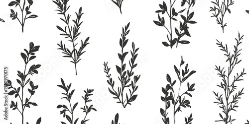 © vadymstock, Obraz premium Seamless black and white botanical pattern with elegant leaf illustrations.