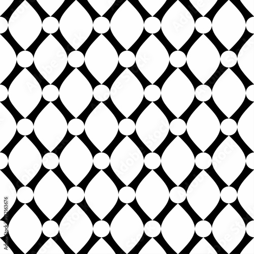 © D2SP , Naklejka premium Seamless black and white geometric pattern, consisting of curves and circle shapes. Suitable for graphic design, textiles, prints, wallpapers, backgrounds, etc.